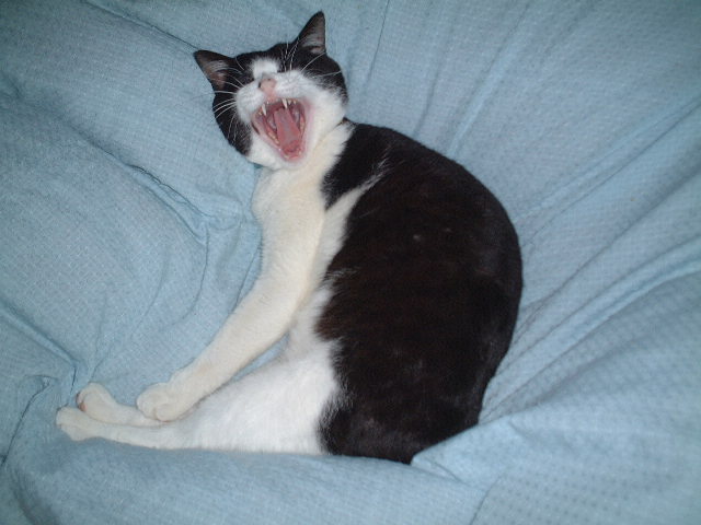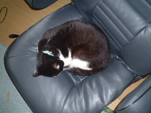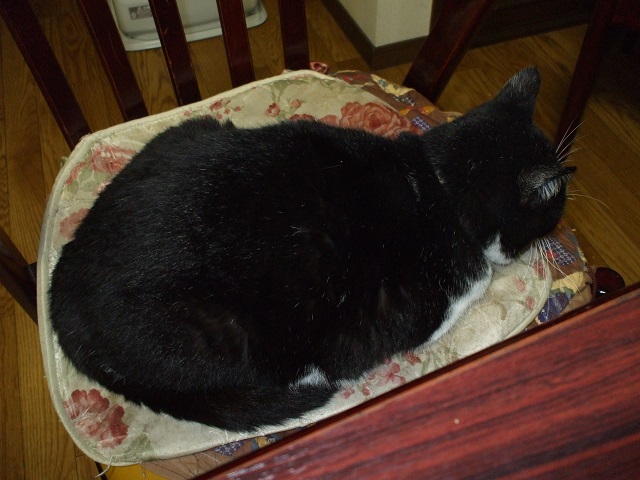 上の写真は、座布団の上で毛づくろいをしているトム。