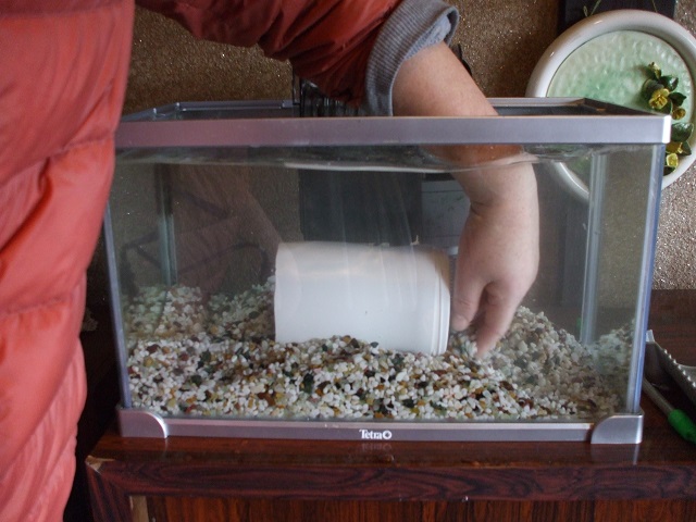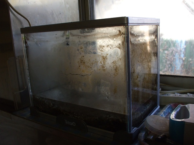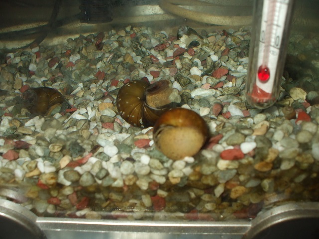 そこで、下の写真のように掃除屋さんのタニシを水槽に入れました。