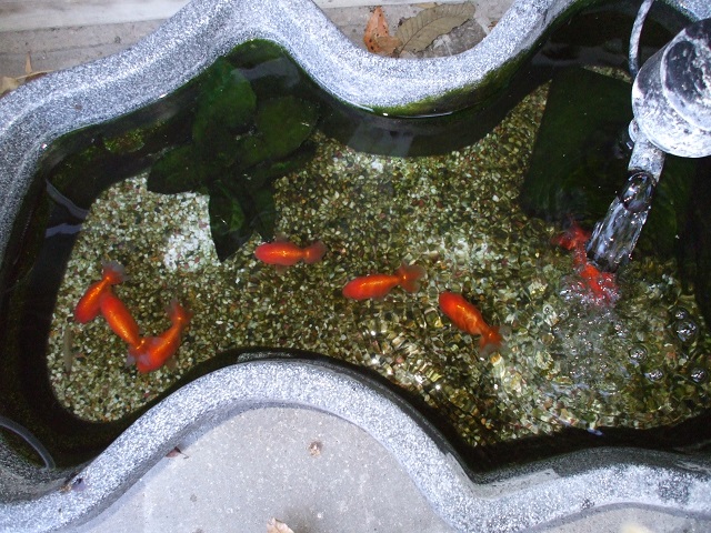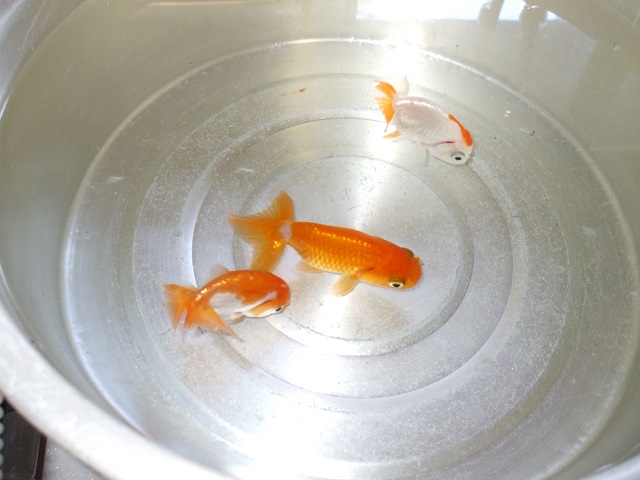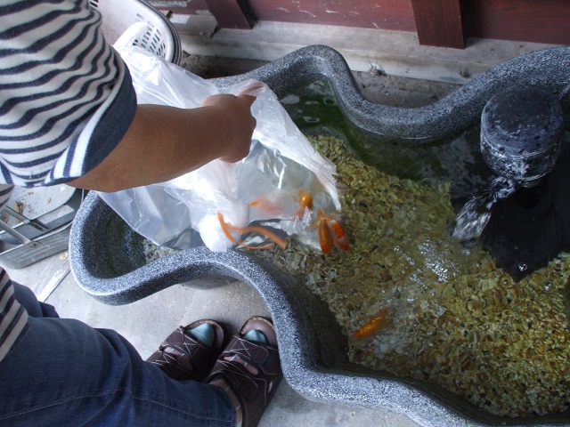 30分ほどして、袋の中のらんちゅうを池に放ってやりました。
