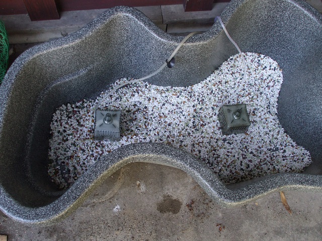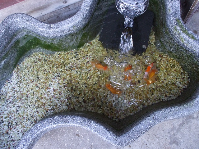 玄関の水槽、プラスチック池にもタニシを入れました。