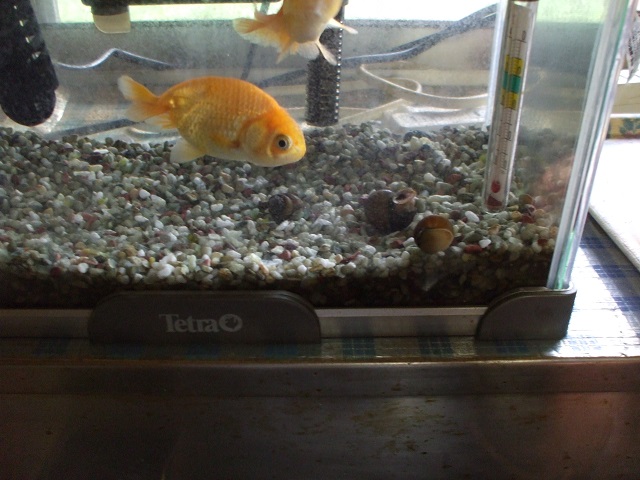 下の写真は、らんちゅうが新入りのタニシを見ているところです。