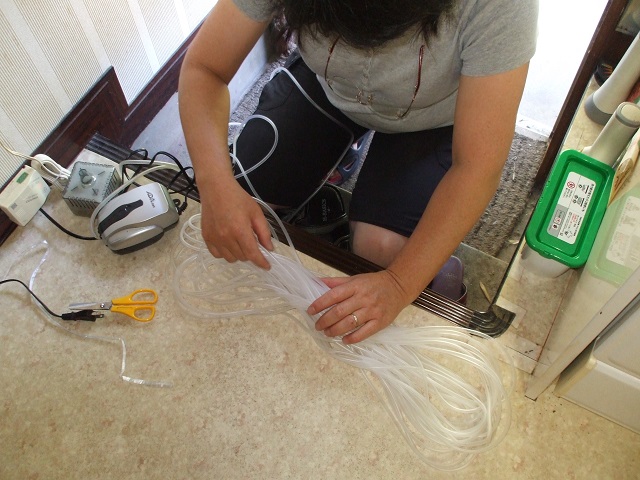 下の写真は、ポンプとフィルターをつなぐパイプをカットしているところです。