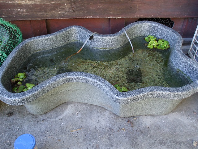らんちゅう以外にも魚を飼おうということになり、妻とプラスチック池の準備をしました。