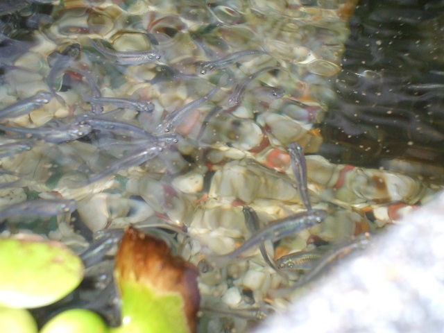 下の写真のように、餌をやるとクロメダカが集まってきます。
