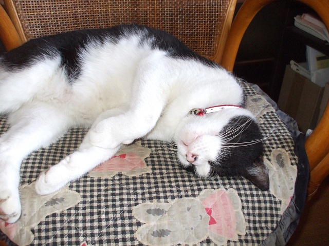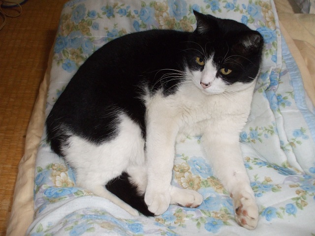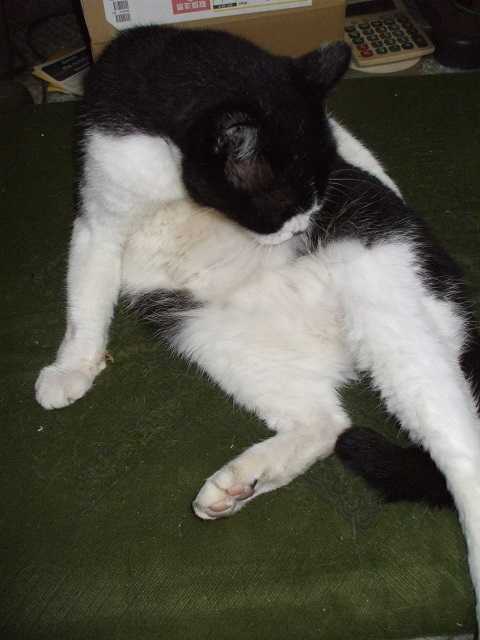 上の写真は、座布団の上で毛づくろいをしているトム。