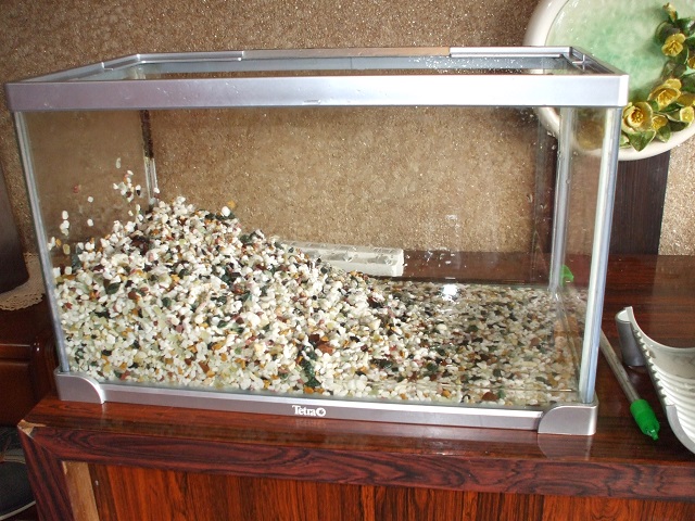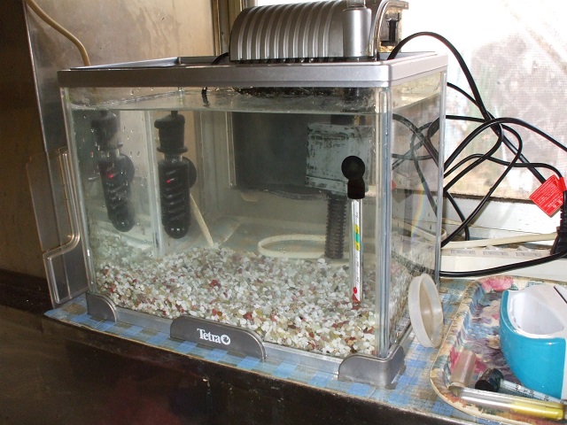 そこで、下の写真のように掃除屋さんのタニシを水槽に入れました。