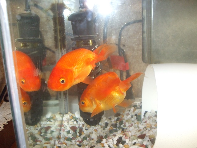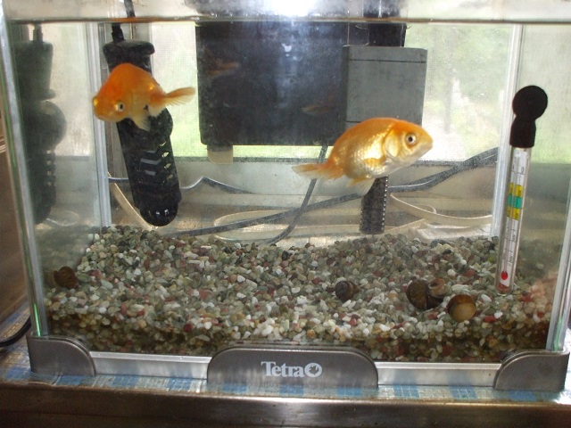 下の写真は、らんちゅうが新入りのタニシを見ているところです。