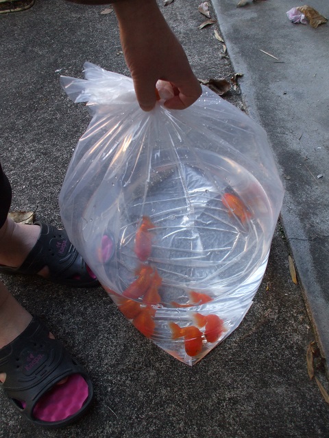 一時間後、ビニール袋に入ったらんちゅうを池に放ちます。(下の写真)