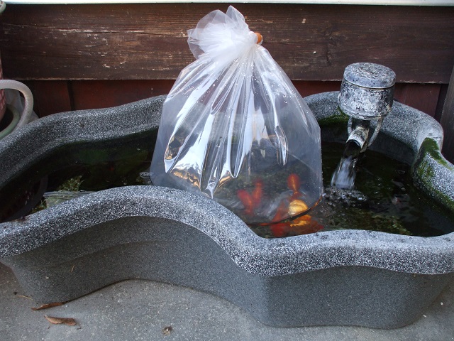 上の写真は水温調節のため、ビニール袋のまま池に入れているところ。