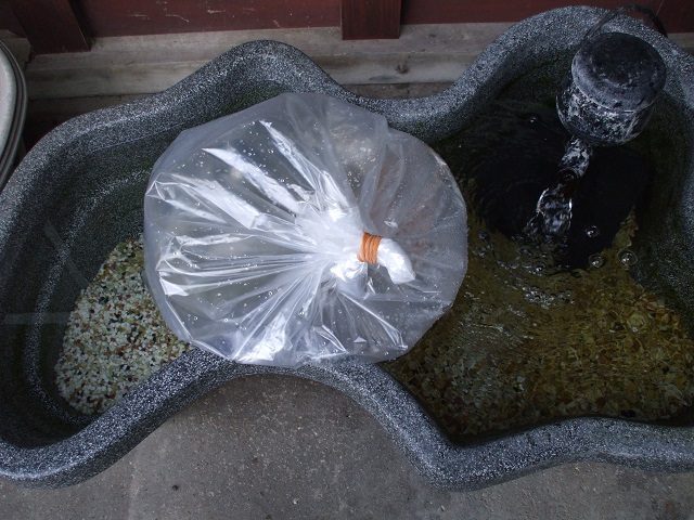水温を調整するために、ビニール袋を池の中に一時間ほどつけておきます。(下の写真)