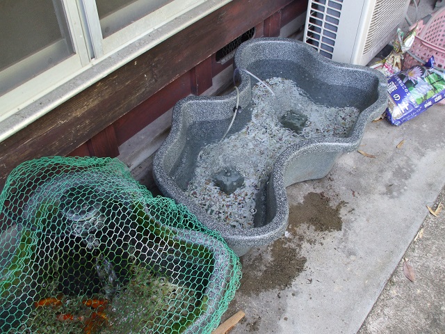 らんちゅう以外にも魚を飼おうということになり、妻とプラスチック池の準備をしました。