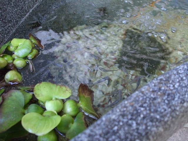 下の写真のように、餌をやるとクロメダカが集まってきます。